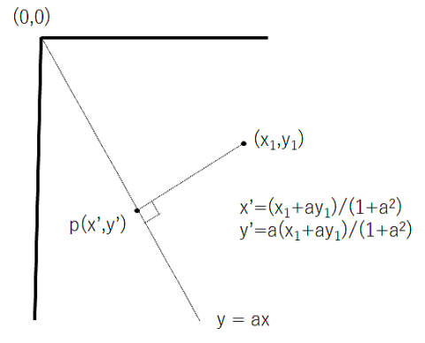 教科書の例題4-3と例解4-3b,e,dとを参考にして, 課題R4_4での移動対象図形Mを, ドラグ後マウスボタンを離したらその色を変える.さらに,以下の図に示すように, Mの重心(x1,y1)とLU直線との距離が最短となるLU直線上の点をpとしたとき, Mの重心が点pとなるようにMを再配置せよ. M以外の図形は動かす必要はない. 再配置後は,他の図形と重なってもかまわない.